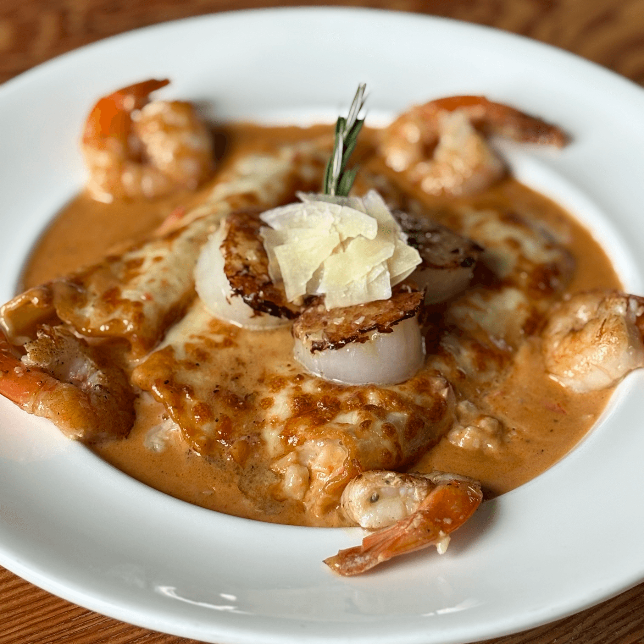 Fresh sea scallops, garlic shrimp, three blue crab & five cheese stuffed lobster Newburg. Add garlic ciabatta toast for additional charge.