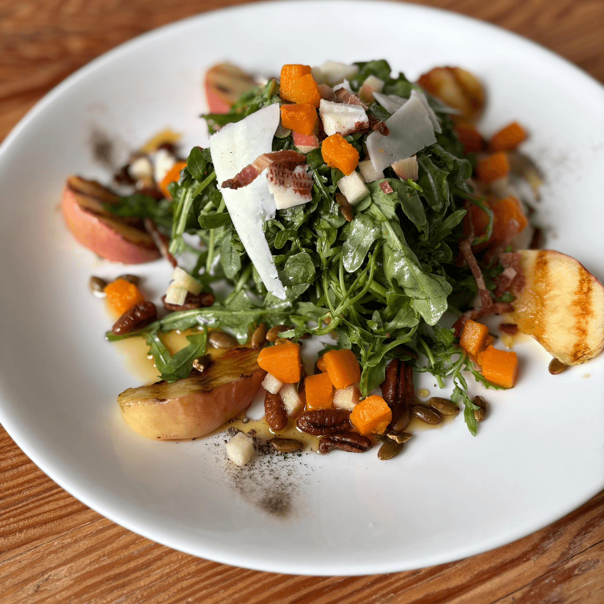 Grilled Honeycrisp Apples with Arugula, Warm Bacon and Cider Vinaigrette, Manchego - Maple Glazed Pecans, Toasted Pumpkin Seeds and Butternut Squash