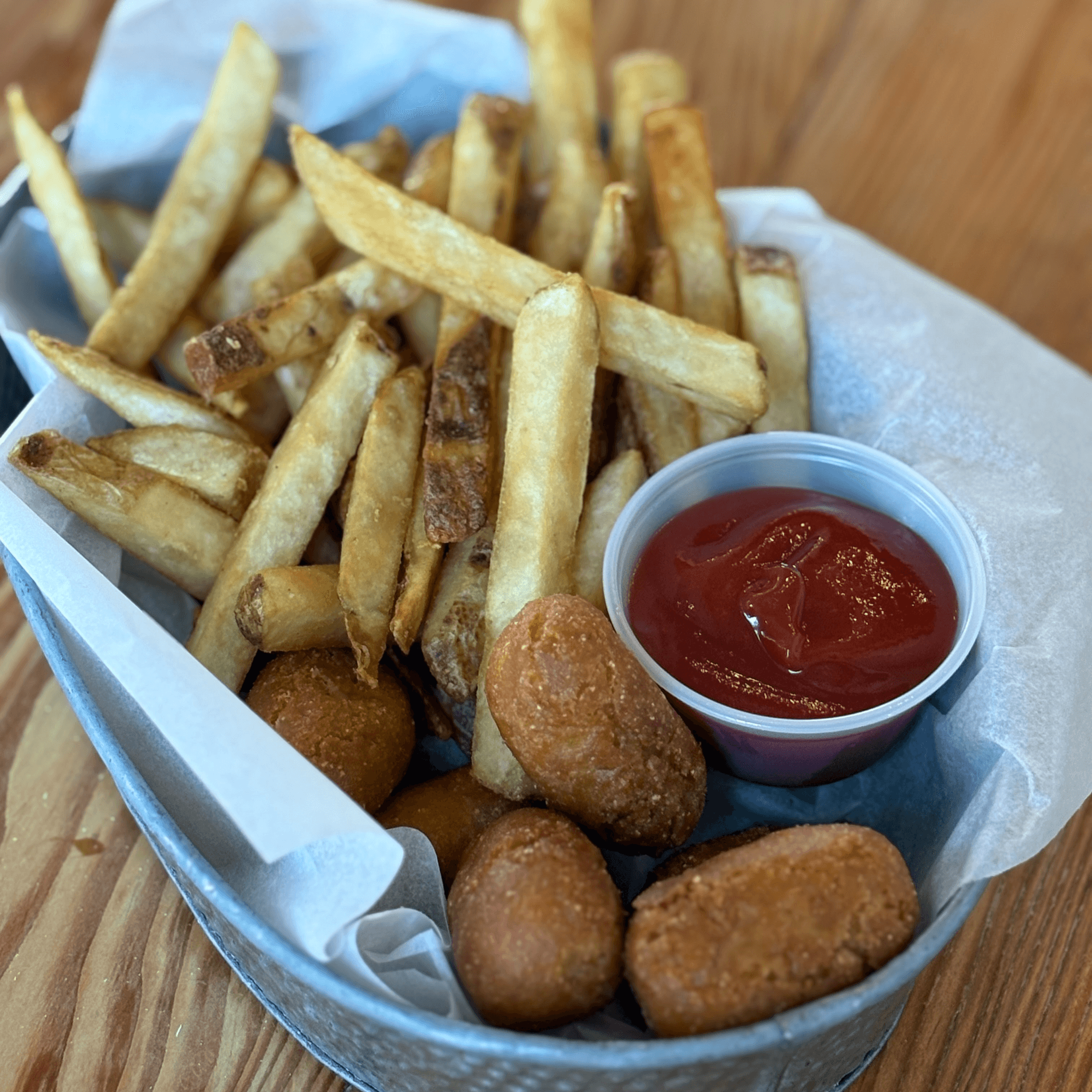 1 Lb. of our brined, smoked drummies & flats crispy & fried. Naked, traditional hot sauce, BBQ or dry rub wings served with celery and bleu cheese or ranch. Dry rub choices: hickory peach porter, Cajun spice, sesame ginger, & jerk seasoned.