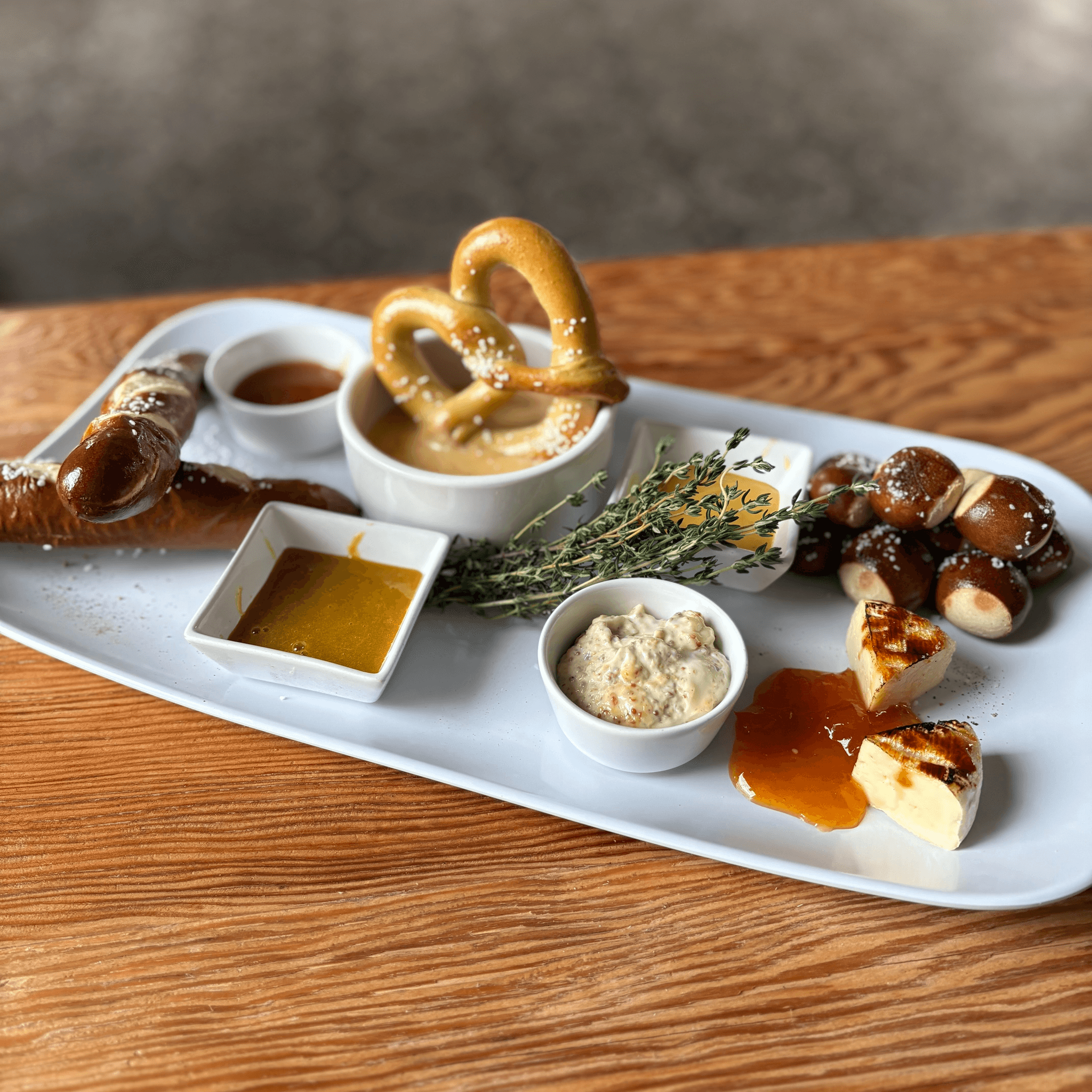 Pretzel Knots, Dippers and Poppers. Carmel, Housemade Queso, Hot Honey Mustard, Whole Grain Mustard Aioli, Apricot Preserves and Brüle Brie